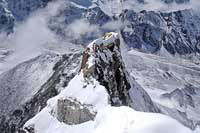 Mi consolo pensando che tra breve sarò al sole e la situazione migliorerà. E’ presto, ho davanti abbastanza tempo e me lo prendo attardandomi a fotografare le canne d’organo, rigole di neve compatta che disegnano bizzarri chiaroscuri sul ripidissimo pendio. Resto solo, ma poco prima delle dieci esco dal cono d’ombra e mi riunisco ai miei due compagni in vetta, i primi della giornata a raggiungere la piatta cima a 6812 metri. Sopra di noi, solo la volta turchina del cielo, senza una nuvola. “Ama”, la Madre, ha voluto ricompensare la nostra paziente attesa con un regalo: una luce abbagliante illumina a trecentosessanta gradi un tripudio di candide vette. Dal Cho Oyu al Pumori alla piramide nera dell’Everest che fa capolino oltre l’imponente bastionata del Lhotse. E poi il Baruntse, il Makalu e, piccolissimo giù in basso, nano tra i giganti, l’Island Peak. Più oltre, a sud, la frastagliata silhouette del massiccio del Kanchenjunga.