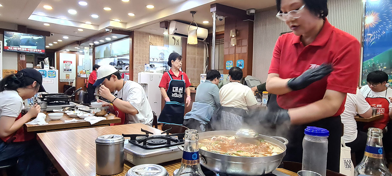 Zuppa di pesce al tavolo in un un ristorante di Busan