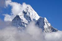 La foschia pomeridiana ci ha accompagnato praticamente tutti i giorni. Assenti al mattino, nubi relativamente innocue risalgono dal fondovalle e ricoprono completamente le montagne ad iniziare dal primo pomeriggio, dove non di rado ci regalano una spruzzatina di neve, per poi dissolversi al tramonto. Avanzare nel grigiore non è il massimo del divertimento per cui l’unico rimedio è partire presto. Passo veloce accanto alle sparute tende del campo due, abbarbicate alle rocce, con la nebbia che si alza dietro di me, inseguendomi, quasi facessimo a gara. Più oltre la cresta si raddrizza, raggiungendo la verticalità con la torre grigia, un pilastro verticale che si affronta sulla destra con tre tiri di divertente arrampicata sino a quando la roccia si trasforma in una sottile crestina di neve a 70°. Un traverso porta ad un couloir da cui si riguadagna il filo di cresta che, da questo punto in poi, è totalmente ghiacciata. Poco dopo, supero un panciuto seracco appeso chissà come alla cresta, sulla cui piatta sommità trovano posto le tende del campo tre. Incombente, sulla verticale del campo, torreggia il Dablam, la “collana” da cui prende il nome la montagna. Il gigantesco grumo di ghiaccio pensile domina questo versante del monte, ed è visibile sin da Namche Bazar, alla distanza di quindici chilometri.