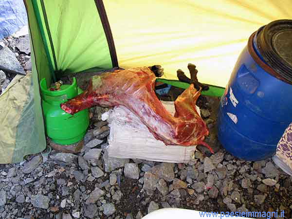 Here we are again, back from camp three, two thousand and two hundred meters above base camp. It 's our last climb before attempting the summit, which will take place at the first "window" available (apparently around 25-26-27 July). Few days of good weather are not enough to reach the top. A mix of good weather and low wind at 350 mbar (the pressure corresponding to the peak). We'll see. For our part, we have complied with all rules for proper acclimatization in (high) altitude in preparation for an ascent without oxygen. For example, to spend at least 30 days around 5000 meters, to sleep ten nights on the wall in the first three high camps (except the last one, at 8000 m at the shoulder, where we hope to stop only the day of the summit). When I look back, I see the enormity of work done. But the near future is to shake in one's boots, knowing that now there are no more excuses or delaying activities. Before us there is only K2. All this to tell you that we are ready and we're fine! While we were at the three a goat came, a skinny little creature that has given us today for lunch (despite itself) the liver. I didn't kwon that I liked it so much! Other supplies arrived, in our absence: rice, oil and ... fresh mango. I've eaten two mangos, taking advantage of the fact that Adriano does not eat canned or fresh fruit. Oddities of Great! The Poles established the camp three on Cesen and returned today, like us, to the base. A couple of Korean stayed at three last night and returned today. The sherpas of Dimitrjescu led large supply of oxygen to c3 for them and for the Koreans. Christian Stangl has stayed last night at c3 and is now down to base this morning with me and Adriano. We cross Merelli and Zaffaroni this morning as they got to one. All other expeditions, both on the Abruzzi and on Cesen that are still awaiting at the base.