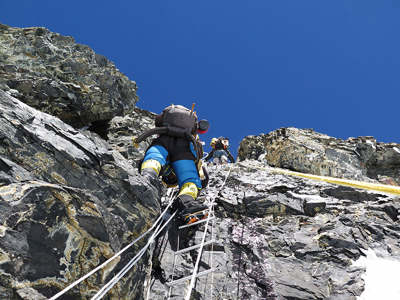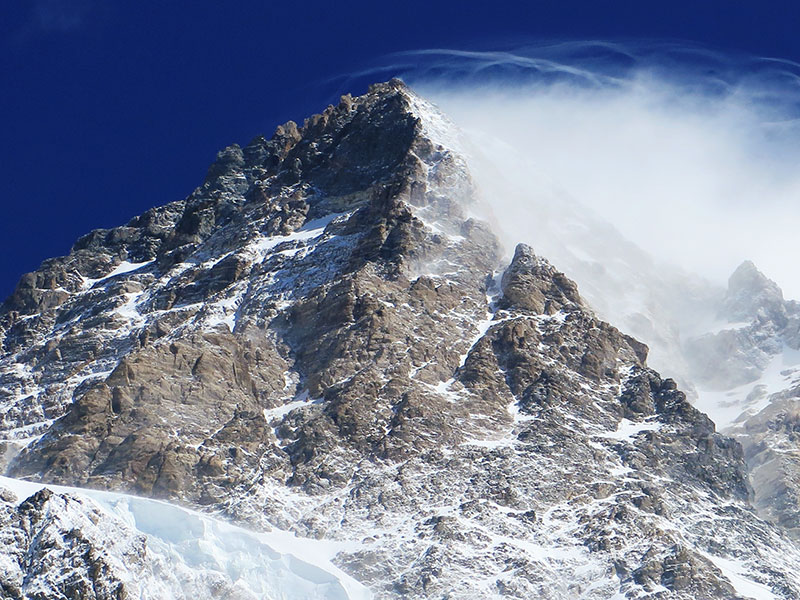 L’avanzata era esasperante perché i primi procedevano a rilento, mentre assicuravano la corda. “Non è esattamente il luogo più sicuro per fermarsi - mi dicevo - ma se non si vogliono correre rischi è meglio non tentare del tutto la salita”. Col passare delle ore la temperatura si è alzata. Le valli in basso si sono ricoperte di serici batuffoli di nuvole che si allargavano, innalzandosi sempre più. Verso mezzogiorno, la maggior parte degli alpinisti, me compreso, aveva raggiunto un pianoro situato duecento metri sotto al cucuzzolo sommitale. Il sole accecante incastonato nel blu oltremare del cielo conferiva al panorama sfumature azzurrine. La vetta sembrava essere a portata di mano, ma a quelle quote si avanza lentamente e le proporzioni ingannano. Mancavano in realtà più di tre ore alla cima. Dopo una breve sosta per rifocillarci, abbiamo ripreso l’interminabile salita. Ci siamo subito sgranati, perché chi aveva le bombole era leggermente più veloce. I soffici ciuffi di nuvole si erano intanto raccolti in un mare compatto, che precludeva la vista più in basso, mentre tentacoli di nebbia si spingevano sin sulla vetta, avvolgendola a tratti. Proseguivo seguendo la traccia, con Amin appena una cinquantina di metri davanti a me, sinché tutto si è chiuso. Mi sono ritrovato a salire per un breve tratto totalmente immerso nella foschia, sinché si è aperta e poco dopo mi sono ritrovato in cima, affacciato su davanzali di nuvole che coprivano le cime intorno. Accanto a me c'erano parecchi altri alpinisti, molti con le maschere per l'ossigeno e tutti avvolti in tute multicolori. Solo il cielo blu scuro tendente al nero dello zenit, era sopra di me.
