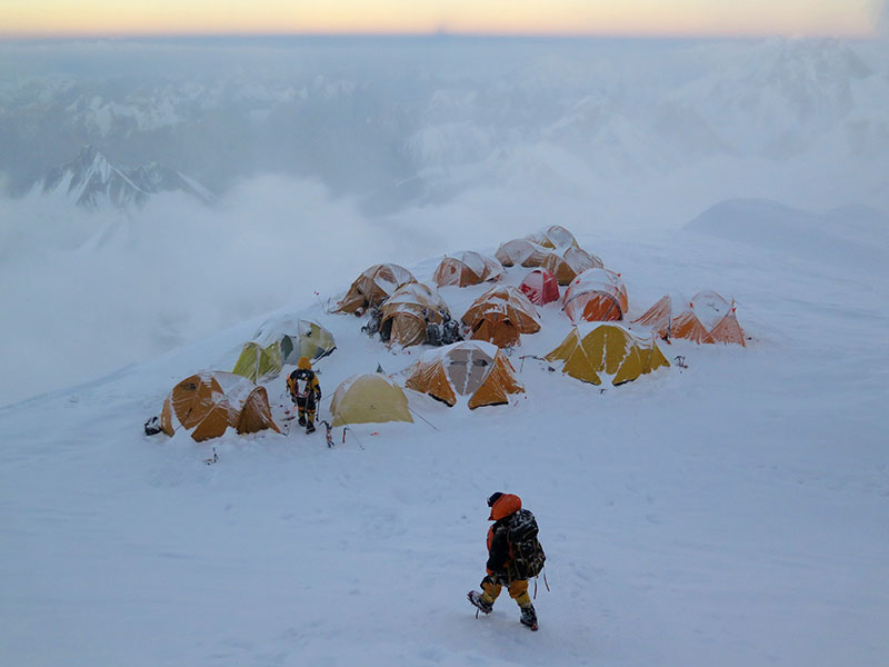 Nel frattempo erano già arrivate al campo base la spedizione italo-pakistana di Agostino da Polenza “K2 sessanta anni dopo”, quella dei polacchi di Janusz Gołąb con il “vecchio” amico Simone La Terra e quella dei due greci Panos e Alex. Nessun altro. Ci siamo subito rallegrati del numero: pochi, ma sufficienti per coordinare le forze in vista della salita. Inoltre, anche la mia scarsa memoria bastava a ricordare il nome di tutti i presenti, cuochi e kitchen boy compresi. I primi dieci giorni al campo base sono stati quelli più spensierati: la vetta incombeva su di noi ma appariva ancora lontana, inaccessibile, avvolta nel mito. Passavamo il nostro tempo a pianificare, a salire al campo due (raggiunto già il due luglio) e a dormire in quota per perfezionare l’acclimatazione. L’atmosfera era cordiale, complice, e non mancavano gli inviti a pranzo e a cena reciproci, anche tra campi base diversi. Non è solo in salita che si fa acclimatazione: qualche discesa di tanto in tanto permette di respirare aria meno secca e più ossigenata rispetto a quella che c'è al campo base. All’Everest è più facile farlo: basta scendere in giornata da Gorak Shep a Tengboche per ritrovarsi a respirare l'aria profumata dei boschi, mentre sul Baltoro le distanze sono maggiori, essendo una distesa di pietre lunga 63 chilometri che ricoprono l'enorme ghiacciaio. Dal c.b. del K2 a quello del Broad Peak ci sono solo tre km ma si scende di appena 200 m. Cionondimeno, ne approfittavamo spesso per farci una passeggiata prima di pranzo. Gli alpinisti incontrati al c.b. del Broad Peak sono sempre stati cortesi con noi: dagli spagnoli, ai messicani, al gruppone internazionale guidato dagli sherpa delle 7 Summit Trek. Non ci hanno mai lasciato tornare indietro senza averci prima offerto qualcosa, da una preziosissima coca cola a un pranzo. Ad esser sincero devo aggiungere che la presenza di Tamara incoraggiava la cortesia dei nostri anfitrioni. Donne ancora non ne erano arrivate al K2 e l’unicità della sua presenza faceva effetto su tutti. La tenda mensa dell’ATP ospitava inizialmente solo noi tre italiani (un bolognese e due sudtirolesi, strano mélange, unito dalla comune passione per le montagne e i salumi) e non difettavano quiete e spazio. Poi, tra il 4 e il 6 luglio sono giunte una dopo l’altra tutte le spedizioni che ancora mancavano all’appello: i cecoslovacchi, la spedizione commerciale della 7 Summit Trek con i nordamericani e le 3 sherpani più la spedizione degli sherpa con al seguito la cinese Lou Jing e la neozelandese Chris Burke con tre sherpa, Cleo Weidlich coi suoi quattro sherpa, più tutto il resto del nostro gruppo internazionale ATP (un turco, un macedone, un finlandese, uno spagnolo, un iraniano, un macedone, uno di Singapore, un tibetano) senza contare gli sherpa al seguito. Il loro ufficiale di collegamento era proprio quello che avevamo ingaggiato per poter proseguire. Tanti nepalesi insieme sul K2 non si ne erano mai visti: alla base della montagna si è creato un "villaggio" di una settantina di persone dove s’incontravano le più svariate incarnazioni dell'alpinismo. Mi hanno molto impressionato gli altari per le offerte e i rituali della puja – di tradizione buddista e nepalese – che hanno idealmente unito il campo sotto una rete di protezione cosmica (per chi ci crede) fatta da coloratissime bandiere di preghiera, del tutto inedite sui monti “islamici” del Pakistan. Gli sherpa sono piuttosto superstiziosi, è risaputo, e nessuno di loro ha messo piede sulla montagna prima della celebrazione della cerimonia da parte del lama, circostanza che ha richiesto un altro paio di giorni. Così, si può affermare che gli sherpa e i loro clienti abbiano compiuto la salita al K2 in meno di venti giorni! Tutti mangiando carne di un grosso zoo (un incrocio tra yak e mucca) macellato per l’occasione: gli sherpa sono tutto fuorché vegetariani! Tutti impiegando bombole di O2. Ma l’uso di ossigeno non è certo un ossimoro per sherpa e clienti, un cavillo da sofisti: l’idea del possibile doping non li sfiora neppure: lo si usa e basta, così come noi tutti indossiamo i ramponi o il piumino d’oca. Ciò che conta è arrivare in cima, sani e salvi, senza congelamenti e nel più breve tempo possibile. Questo modo pragmatico di affrontare le cose può apparire sbrigativo, molto amerikano. Mi fa venire in mente, chissà perché, Indiana Jones che ne "I Predatori dell'Arca Perduta", munito di revolver, spara all’abile spadaccino arabo che gli si para innanzi minaccioso senza pensarci su due volte. E’ un po’ da barbari dell’alpinismo, se volete, ma indubbiamente risulta efficace, pratico e sicuro. D’altronde agli sponsor e al grande pubblico interessa solo sapere se si è saliti in vetta o meno, mica “come” lo si è fatto. Tant’è che al c.b. del K2, quando ho potuto incontrare la statunitense Weidlich (coetanea, nonché collega ingegnere nucleare) ho appreso la sua versione di come sono andate veramente le cose la scorsa primavera all’Everest e al Lhotse. Mi ha spiegato nei dettagli come si sia giunti alla prima salita all’Everest assistita dall’elicottero (acronimo spiritoso: A.A.A.: Aviation Assisted Ascent). Non vi stupirà saperlo, ma la miliardaria cinese Wang Jing, unica nel 2014 a salire in vetta all’Everest dal versante nepalese partendo dal C2 dove si era fatta portare in elicottero assieme ai suoi otto sherpa, ha investito centinaia di migliaia di dollari nella salita, tra una quisquilia e l’altra… Forse parlare di nuovi barbari che vanno a braccetto coi nuovi ricchi al tramonto di un'epoca non è poi un’ipotesi tanto azzardata!